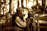 Affectionate couple of young hikers. Caucasian man with beard and woman in cap with big backpacks kissing in forest. Hobby, nature, love concept