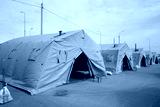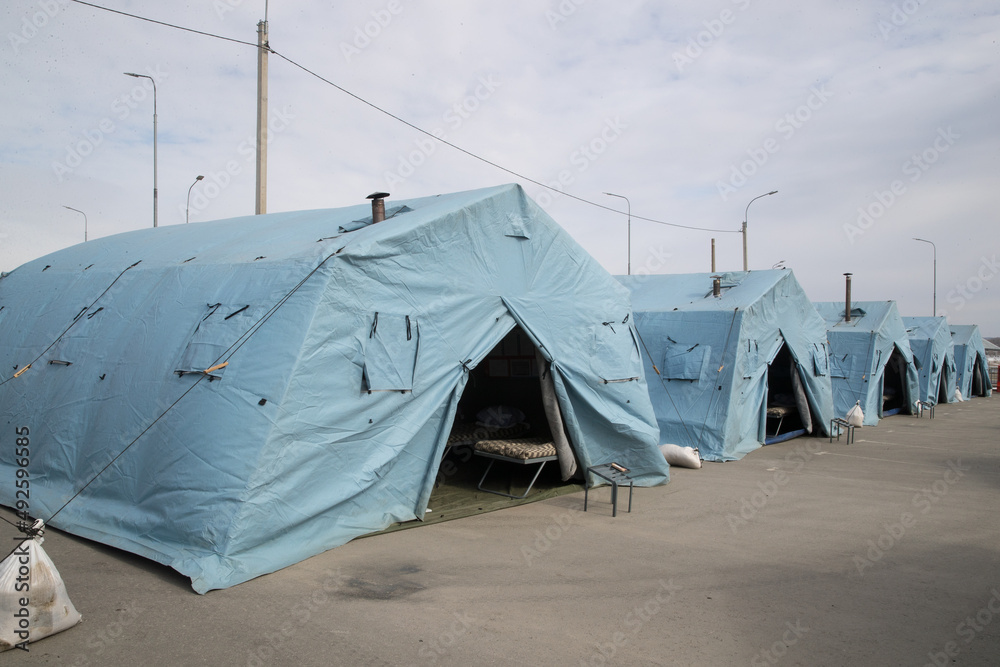 new tents for refugees from Ukraine.mobile building, temporary refugee camp.refugee camp.isolation tent at the refugee distribution center.Refugee boot camp