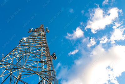 Vertical view of a communications tower showing installed multi-services telecom equipment including Microwave and 5G cellular repeaters. In view are also installed PTZ CCTV cameras.