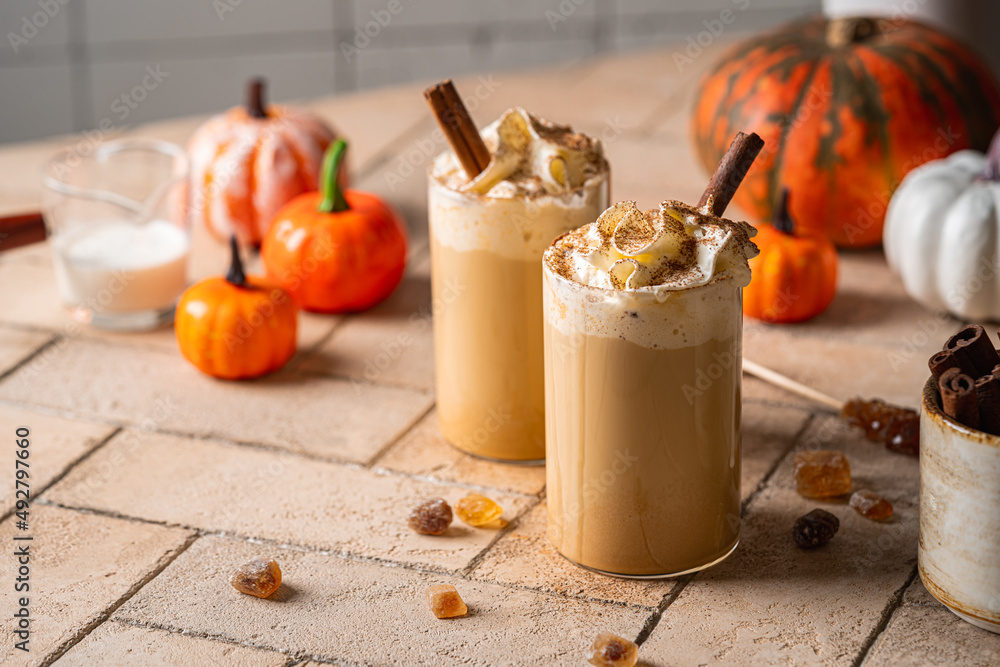 Autumn pumpkin spice latte with whipped cream and cinnamon on light background