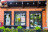 Outdoor mock up of store and shop front template - front view vintage black grey shop tone with blurred windows display, vintage lamp green bush plant and orange brick wall.