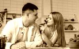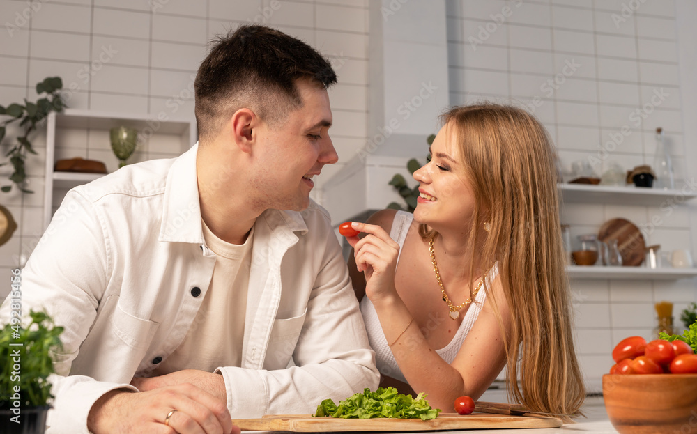 Married couple cooking at home. Beautiful woman feeding husband tomato while making vegetables salad. Happy husband and wife looking at each other, smiling and laughing. High quality photo