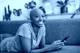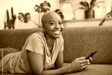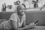 A young woman lies on the sofa with her mobile phone