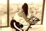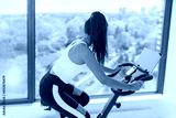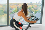 Exercise at home indoor cycling with online class on screen. Woman training cardio biking on workout spin bike active fitness lifestyle.