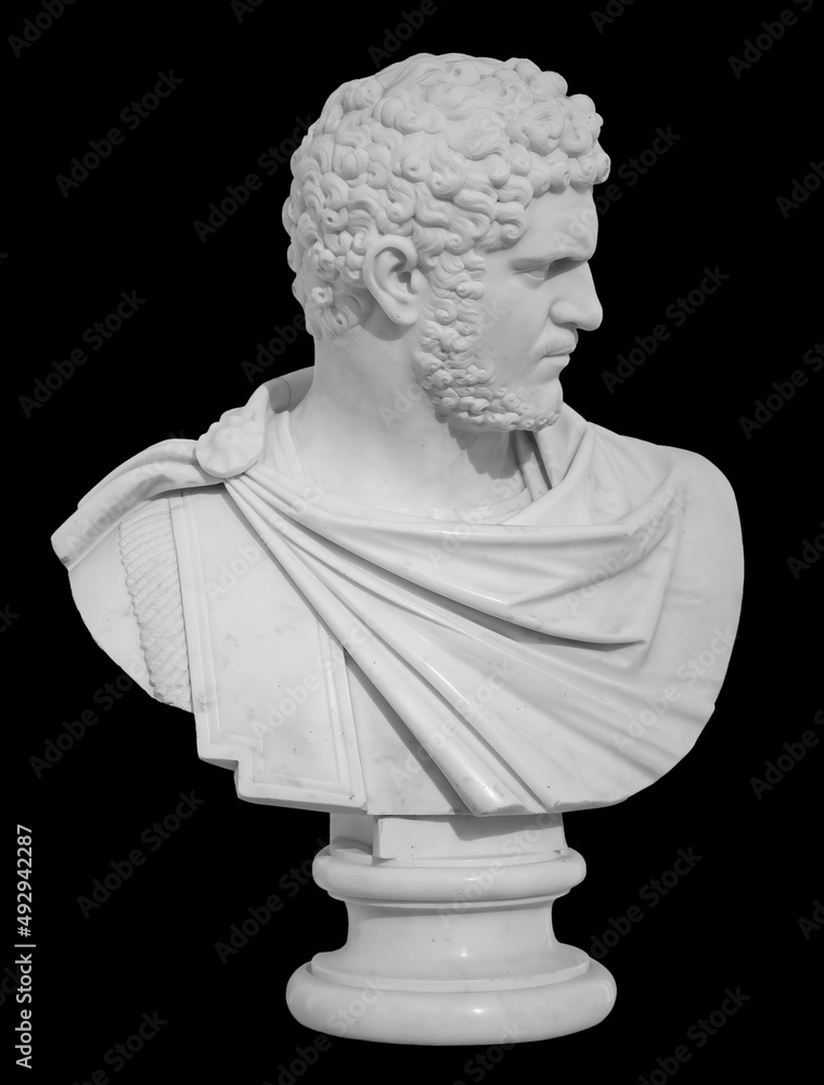 Ancient white marble sculpture bust of Caracalla. Marcus Aurelius Severus Antoninus Augustus known as Antoninus. Roman emperor. Isolated on a black background with clipping path