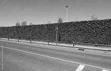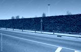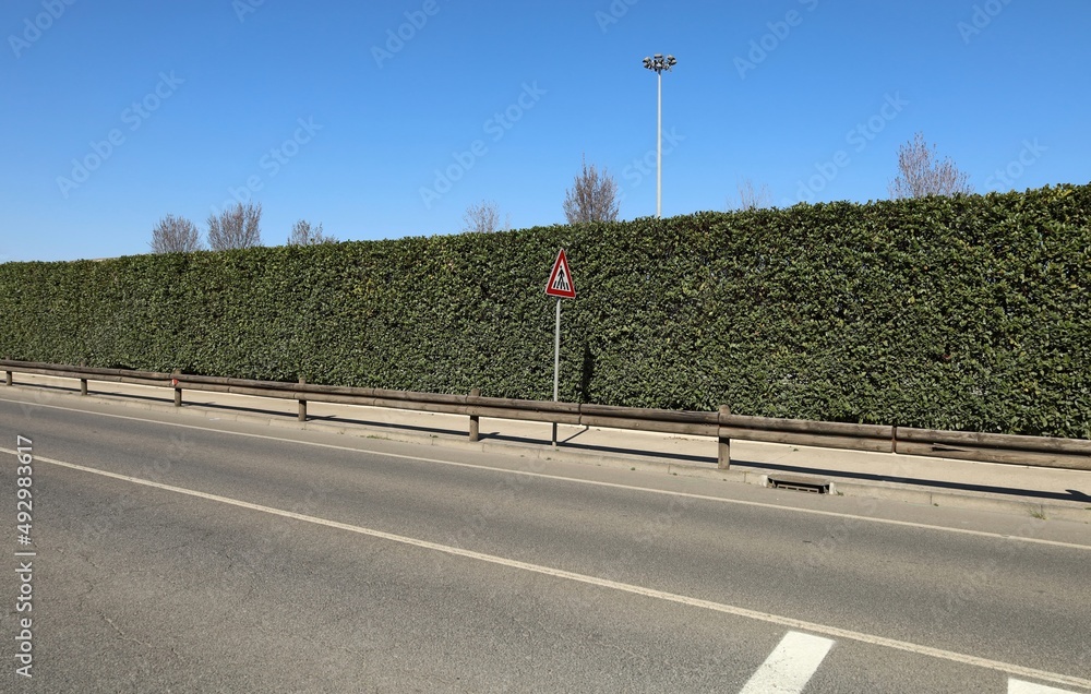 Two lane road with guard rail, high hedge fence, concrete sidewalk and pedestrian crossing sign. Background for copy space.