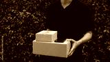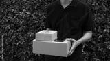 Closeup fast and express Delivery man standing in black shirt carrying cardboard boxes or parcel with green leaves nature garden background and copy space. Environmentally friendly business concept