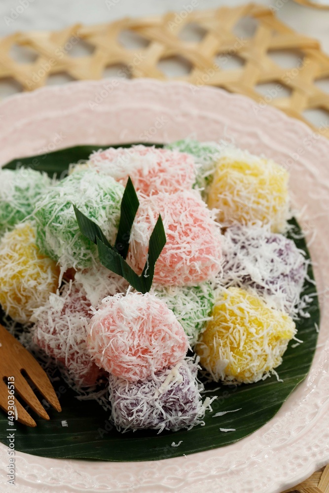 Colorful Ongol-Ongol or Sentiling, Steamed Cassava Cake Coating with Grated Coconut
