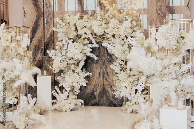 Wedding arch at the luxury restaurant. White flower arch. Trend in the wedding banquet room is marble background.
