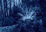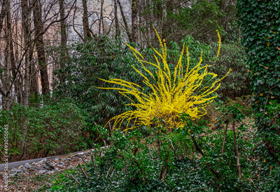 A single, Yellow forsythia bush in springtime is an ornamental deciduous shrub