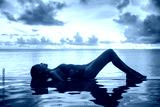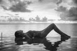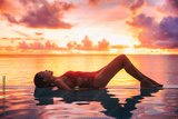 Vacation travel in paradise with sunset idyllic vacation woman silhouette relaxing in infinity swimming pool with beautiful colorful sky. Perfect amazing travel destination