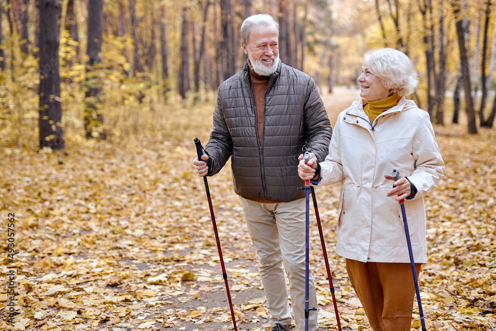 Happy aged couple in love engaged in Nordic walking going in autumn nature park, forest. Concept of active elderly people during retirement. Everyday joy lifestyle without age limitation.