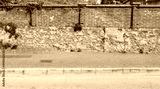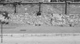 Grunge boundary brick wall, porphyry sidewalk and asphalt road in front. Background for copy space
