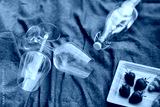 Romantic picnic with strawberries and white wine on the red blanket. Relaxation for couple at nature.