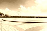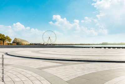 Empty square floor and playground ferris wheel with sky clouds