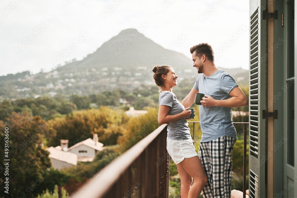 This is how we spend our weekends. Shot of an affectionate young couple drinking coffee while standing on their balcony at home in the morning.