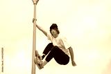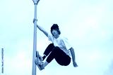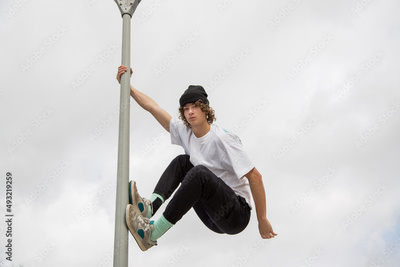 young Caucasian man on a lamppost holding his hand and looking at the camera