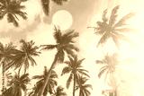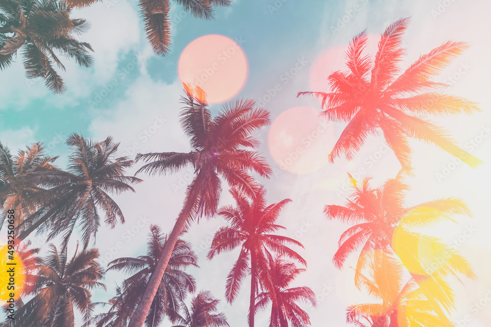 Tropical palm tree with sun light on sunset sky and cloud abstract background.