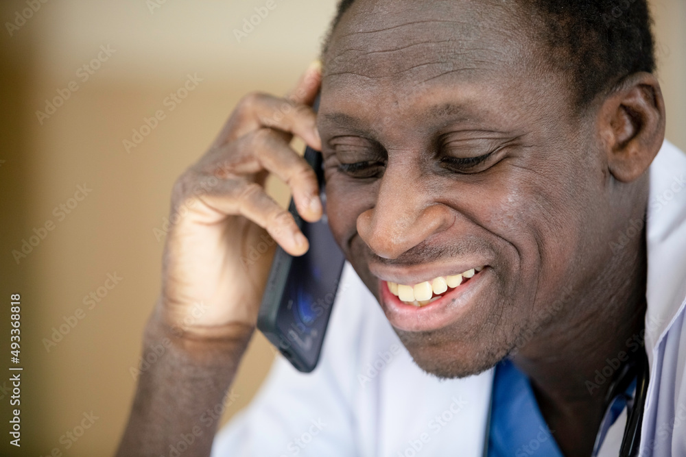 Close up African American medical male doctor talking with mobile phone.