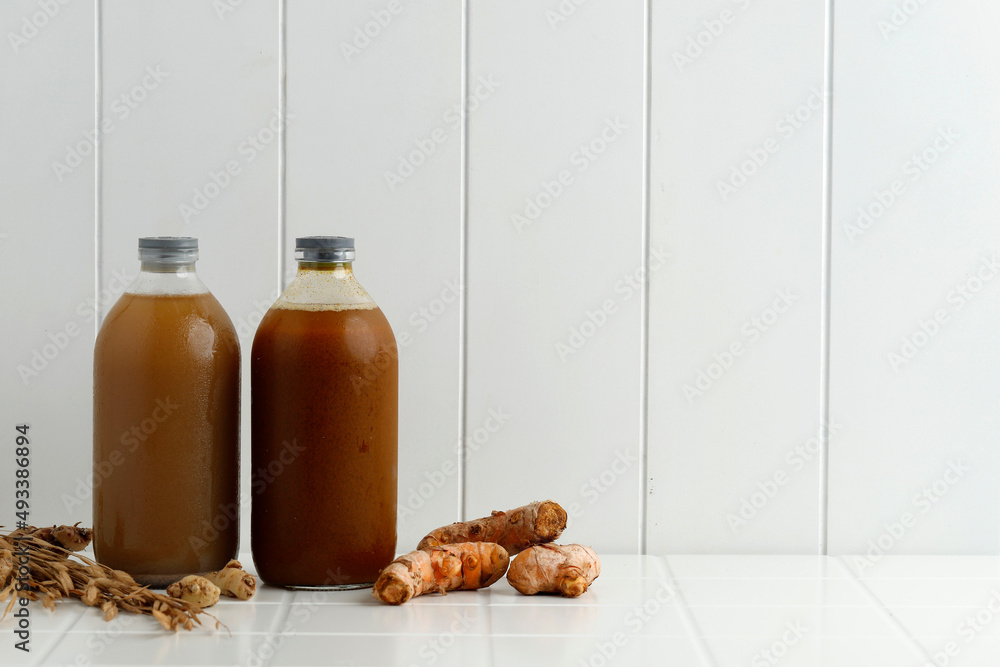 Jamu Indonesian, Traditional herba Drink Called Beras kencur and Kunyit Asem, White Concept Celan Modern Healthy Drink, White Concept