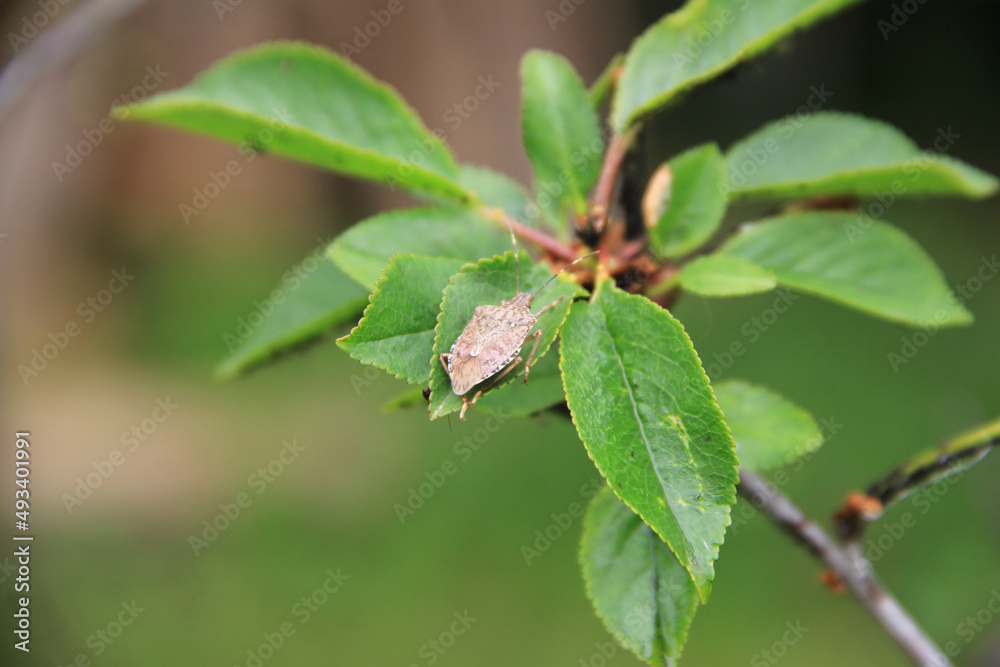 Brown Marmorated shield bug on Sour Cherry branch in the orchard. Halyomorpha halys insect on Prunus cerasus tree