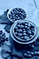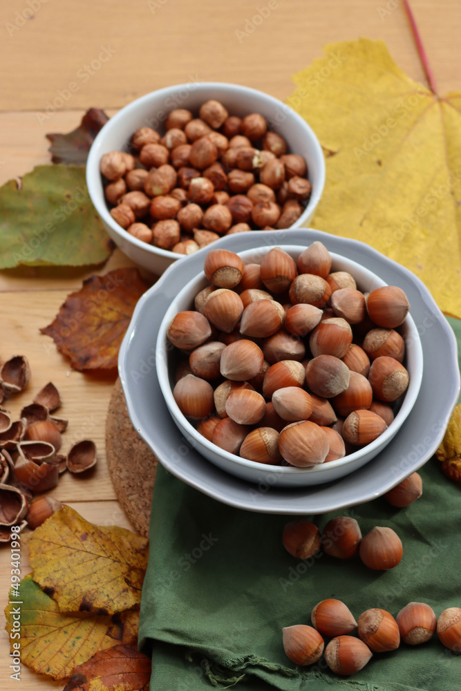 Whole hazenuts in a bowl with cracked hazenuts and autumnal leaves on wooden background