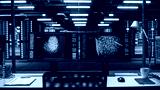 On the Desk Standing Green Mock-up Screen Computer. In the Background Technology Development Laboratory without People. Concept of Cloud Computing and Cyber Security