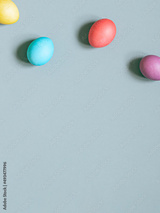 Colorful painted Easter eggs on the grey background. Top view. Copy space