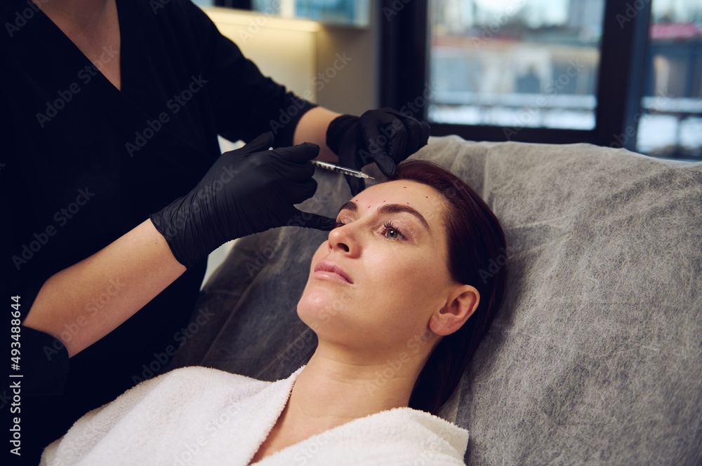Close-up cosmetologist beautician aesthetician injecting a botulinum toxin injection in the forehead of middle aged European woman in wellness spa clinic for rejuvenating anti-aging therapy