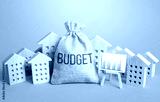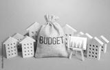 Money bag budget and real estate. Municipality budget of community. Collection of taxes and fees. City services. Effective management, governance of funds. Energy efficiency, urban planning innovation