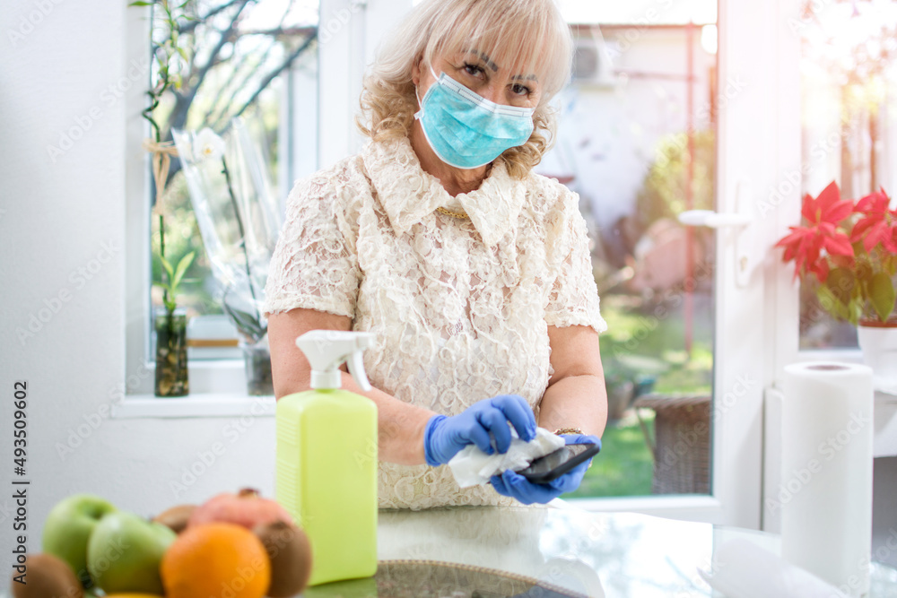 Mature woman in protective face mask and latex gloves using alcohol spray and tissue to clean mobile phone before using it as prevention of Corona virus.