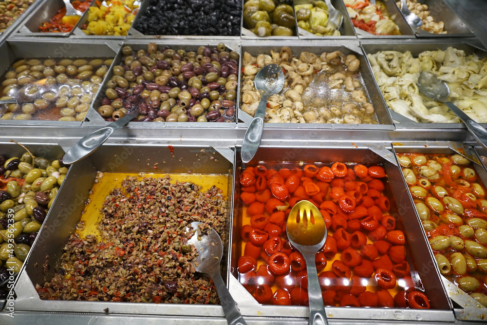 variety of colorful fresh olive and vegetable salad in restaurant
