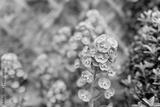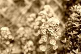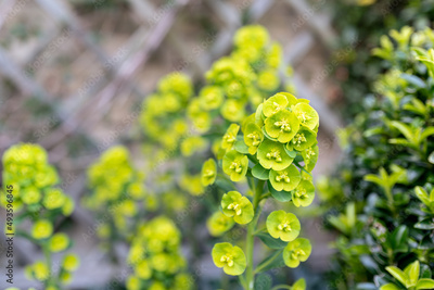 Shallow focus of a springtime Tree Spurge seen growing in a dense colony in a walled garden. A wooden wall trellace is seen in the background