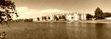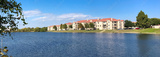 Panorama rear view waterfront apartment complex with grassy lawn in Lewisville, Texas, America under cloud blue sky