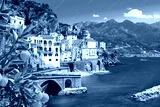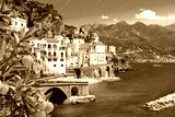 Beautiful view of Amalfi on the Mediterranean coast with lemons in the foreground, Italy