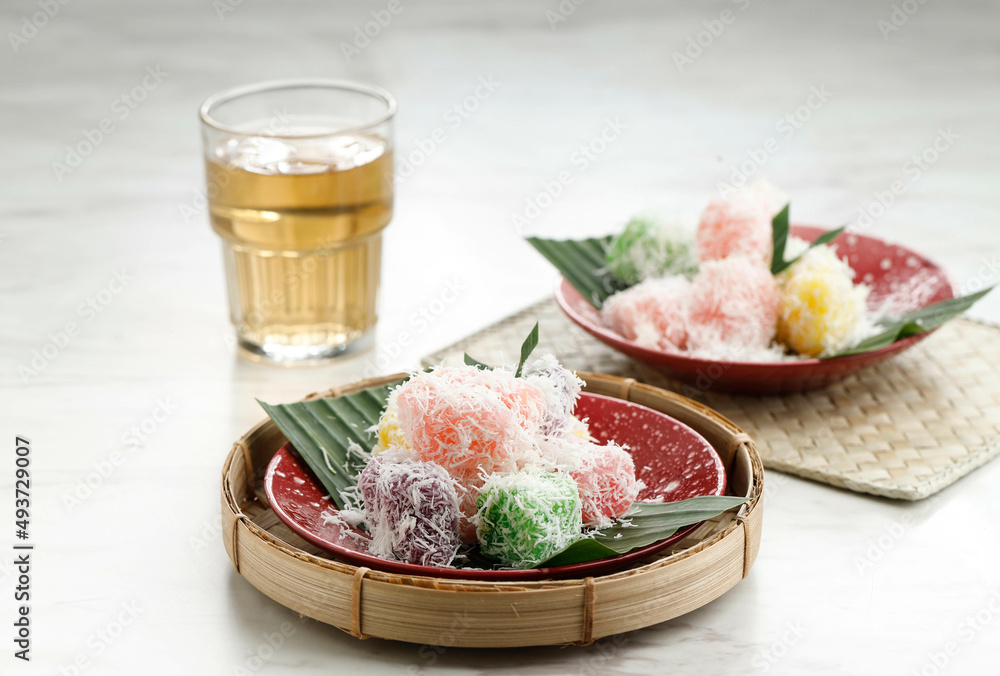 Colorful Ongol-Ongol or Sentiling, Steamed Cassava Cake Coating with Grated Coconut, Served on Ceramic Plate.