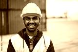 Happy Indian man smiling on camera with industrial port on background - Focus on face