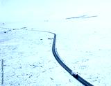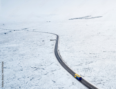 Aerial view of A82 road through Rannoch Moor and Black Mount covered in snow during winter