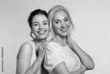 Young woman and smiling senior lady hugging portrait. Modest shy millennial daughter covering face with palm cuddling confident experienced aged mother from back. Trust protection, love support