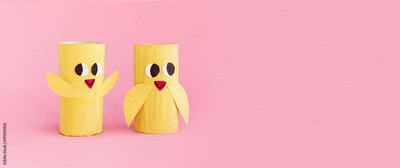 Holiday easy DIY craft idea for kids. Toilet paper roll tube toy's cute chick on pink background banner. Creative Easter, Christmas decoration eco-friendly, reuse, recycle handmade minimal concept