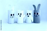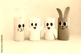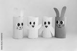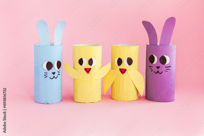 Holiday easy DIY craft idea for kids. Toilet paper roll tube toy's rabbit and chick on pink background. Creative Easter or Christmas decoration eco-friendly, reuse, recycle handmade minimal concept