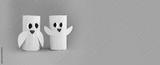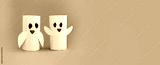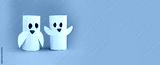 Holiday easy DIY craft idea for kids. Toilet paper roll tube toy's cute chick on pink background banner. Creative Easter, Christmas decoration eco-friendly, reuse, recycle handmade minimal concept