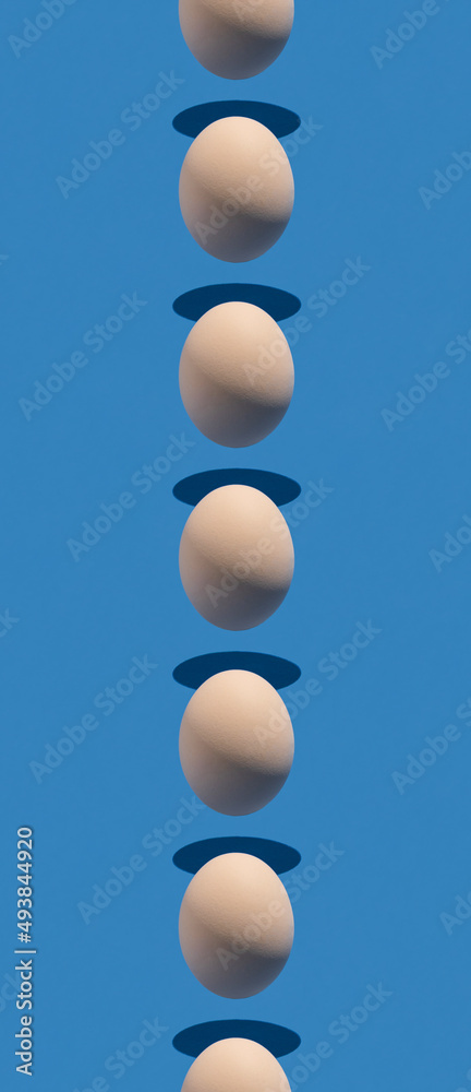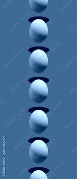 Easter eggs geometric idea on vivid blue background. Minimal vertical pattern composition, creative holiday season and healthy food concept.