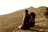Portrait of happy young female backpacker sitting on stone and looking at camera. Woman hiking in mountains. Hiking concept