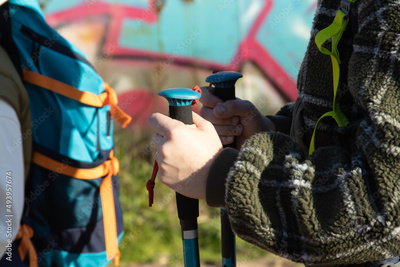 Close-up of young female backpacker walking with hiking poles. Woman wearing warm sweatshirt hiking outdoors. Outdoor weekend concept