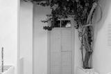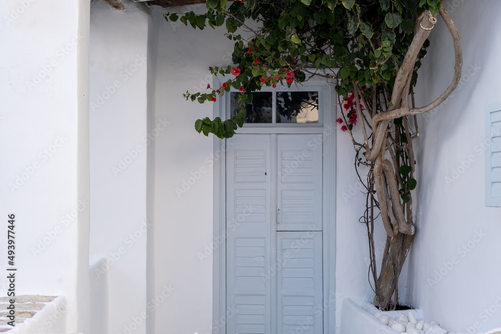 Greek Island, Cyclades. Grey wooden close retro door whitewashed stonewall, red bougainvillea plant.