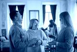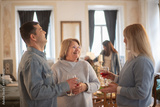 Happy mid adult couple talking to senior woman at wine glass. Married couple having family party at home. Family party, event concept