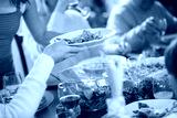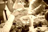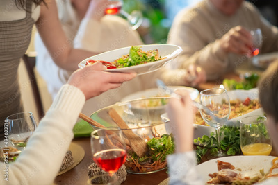 Close-up of female hand passing salad during dinner. Family sitting at table with salad, pasta and glasses and having meal. Family party concept