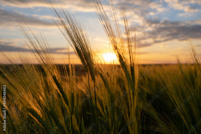 Picturesque summer scene with wheat field and sunset. Colorful sunset with a clouds. Wonderful rural landscape.
