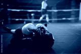Close-up of female boxer knocked out in final round. Two young girls boxing on ring and one girl lying on floor after strong blows of her rival, loosing match. Extreme sport and womens boxing concept
